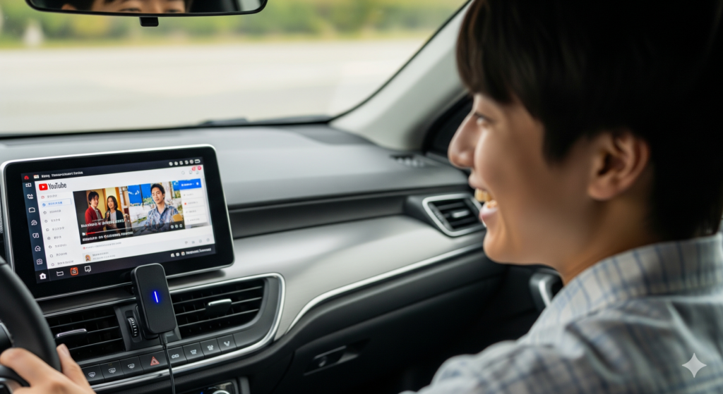 「車のナビをスマホにする魔法」っていうキャッチコピーがピッタリで、普通は走行中に見れないYouTube、Netflix、Amazonプライムビデオなんかが車のディスプレイで楽しめるようになる。まるで家のリビングにいるような感覚で、車内エンタメを満喫できるんだよ。