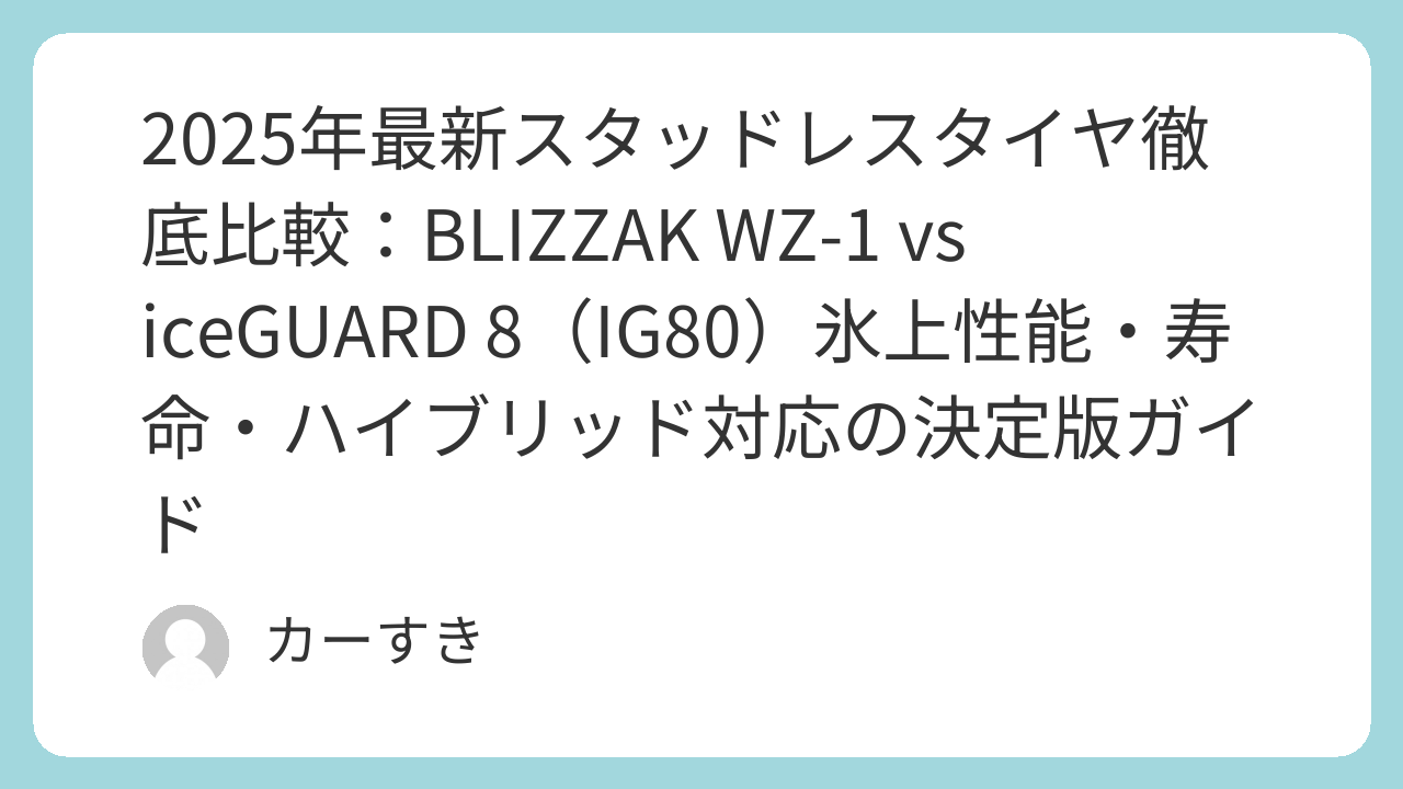 WZ-1とIG80の比較、2025年の最新スタッドレスタイヤ選びで最も注目される対決について解説します。ブリヂストンのBLIZZAK WZ-1とヨコハマのiceGUARD 8(IG80)は、どちらも最高峰の氷上性能を誇りますが、その技術アプローチと強みは異なります。氷上ブレーキ性能の数値を重視し、ハイブリッド車との相性を考えるならIG80、4年後までの性能持続性と総合バランスを求めるならWZ-1が有力な候補です。