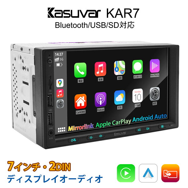 KASUVAR KAR7は、7インチの2DINディスプレイオーディオで、Apple CarPlayとAndroid Autoに対応している点が大きな特徴です。スマホと連携することで、ナビアプリや音楽、通話などの機能を車のディスプレイ上で操作できます。